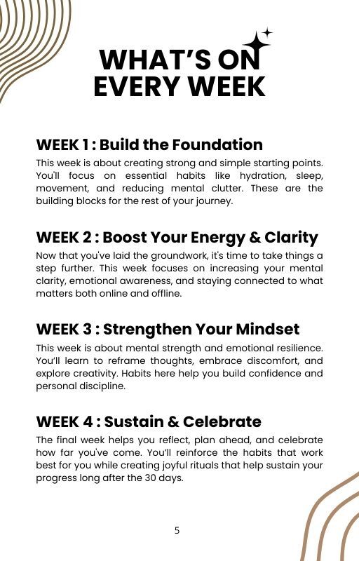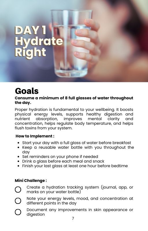 Each day focuses on small, achievable actions—like mindful eating, digital detoxing, moving your body, or journaling—designed to create long-term change without overwhelm.